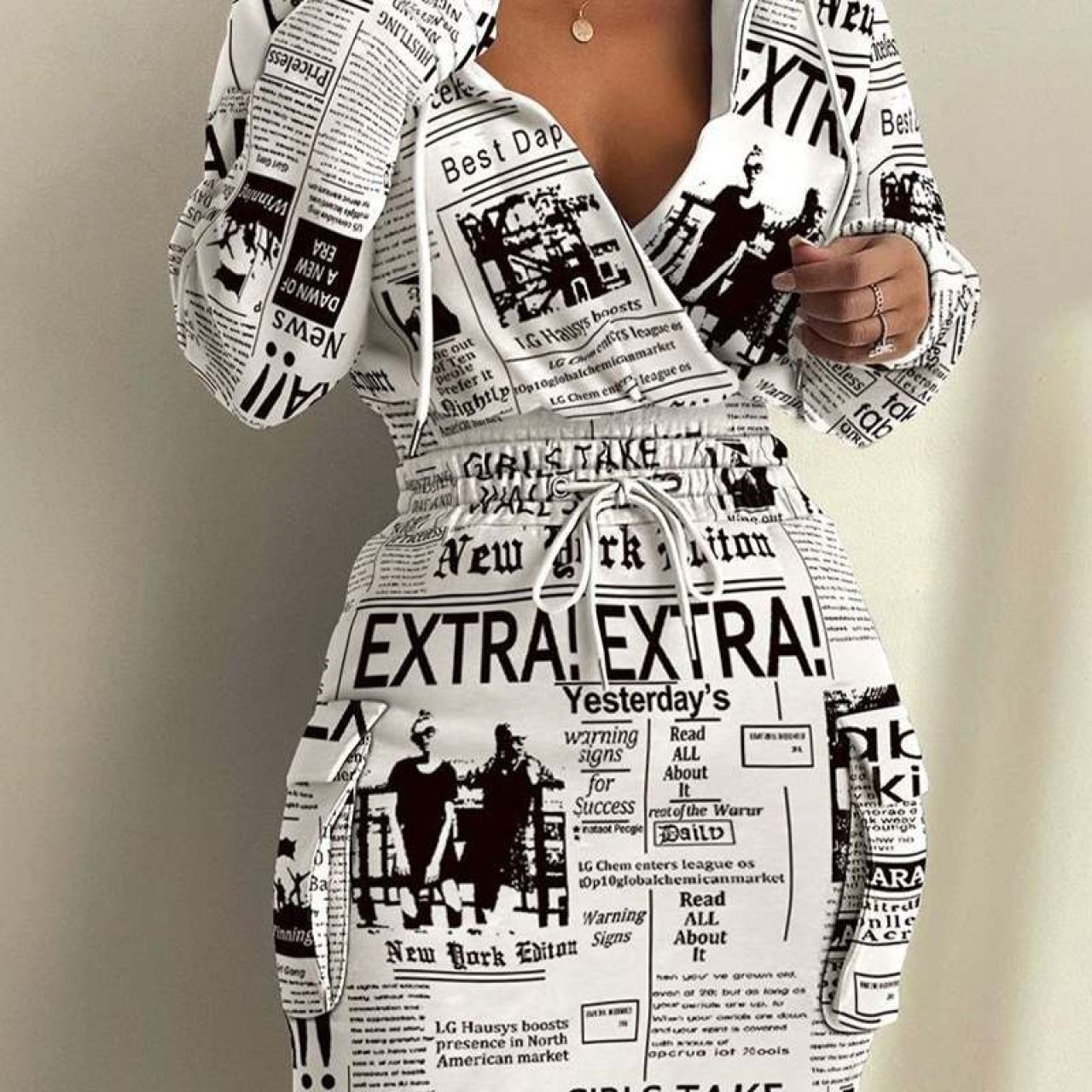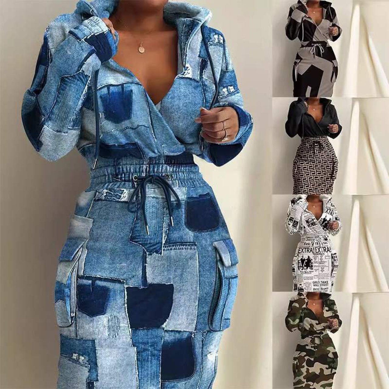 This Hoodie and Geometric Pattern Skirt Set is a stylish and comfortable choice for casual wear during cooler seasons. The set includes a cozy hoodie with a deep V-neckline and a high-waisted skirt featuring a bold geometric design.