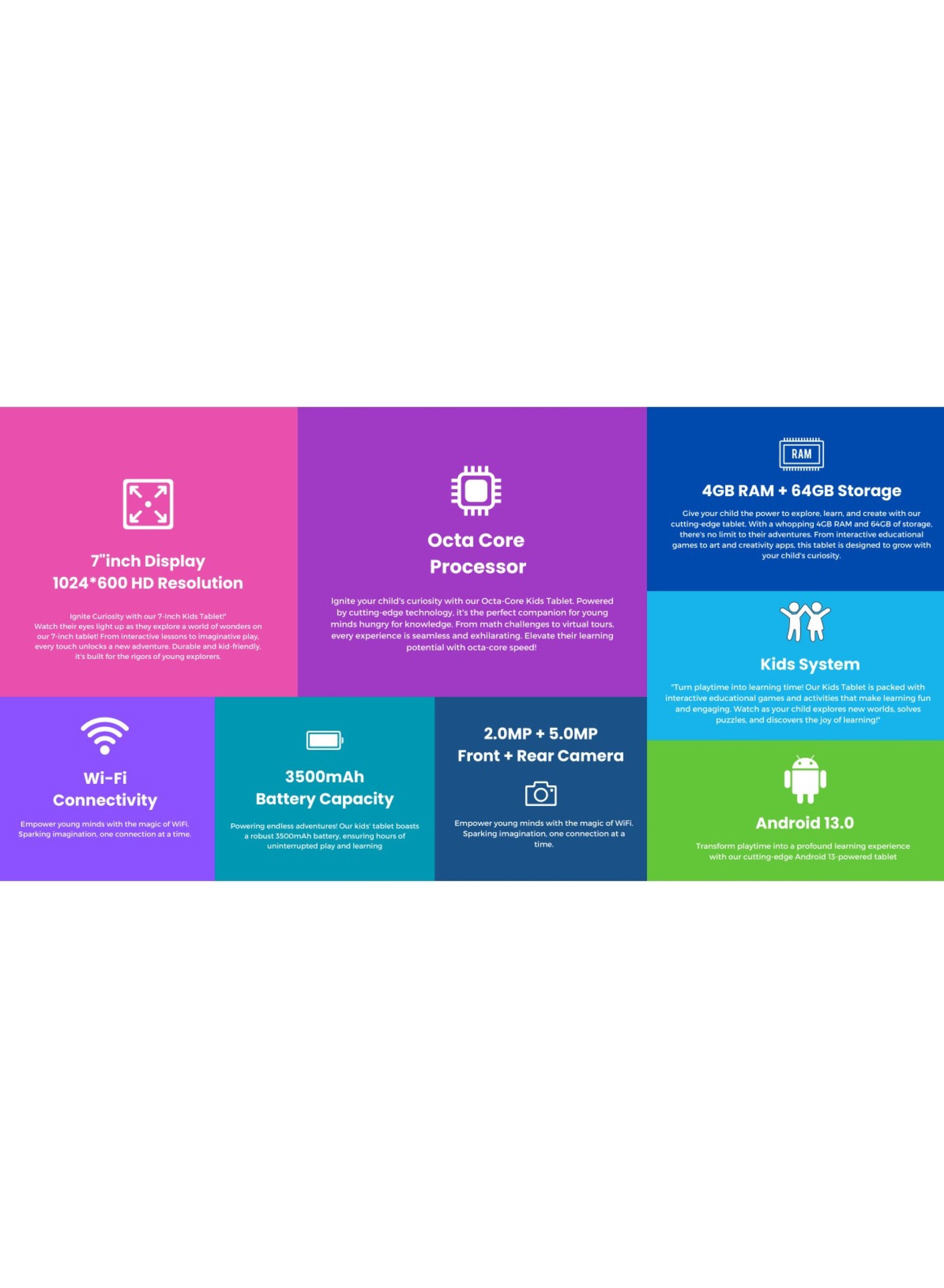 - A robust 3500mAh battery ensures hours of uninterrupted usage, allowing kids to play, learn, and explore without frequent recharges.