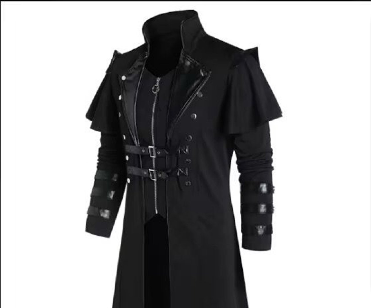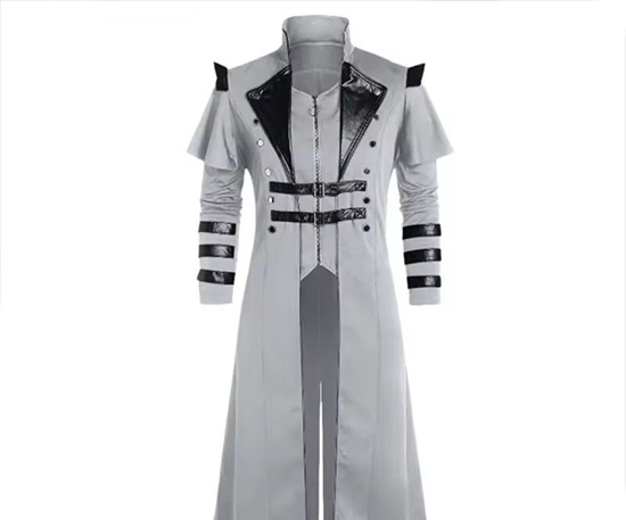 Tailored for formal occasions, cosplay, or avant-garde fashion enthusiasts, the coat’s structured high collar adds sophistication and warmth. The full-length silhouette pairs well with boots or dress shoes, creating a commanding and stylish look from head to toe.