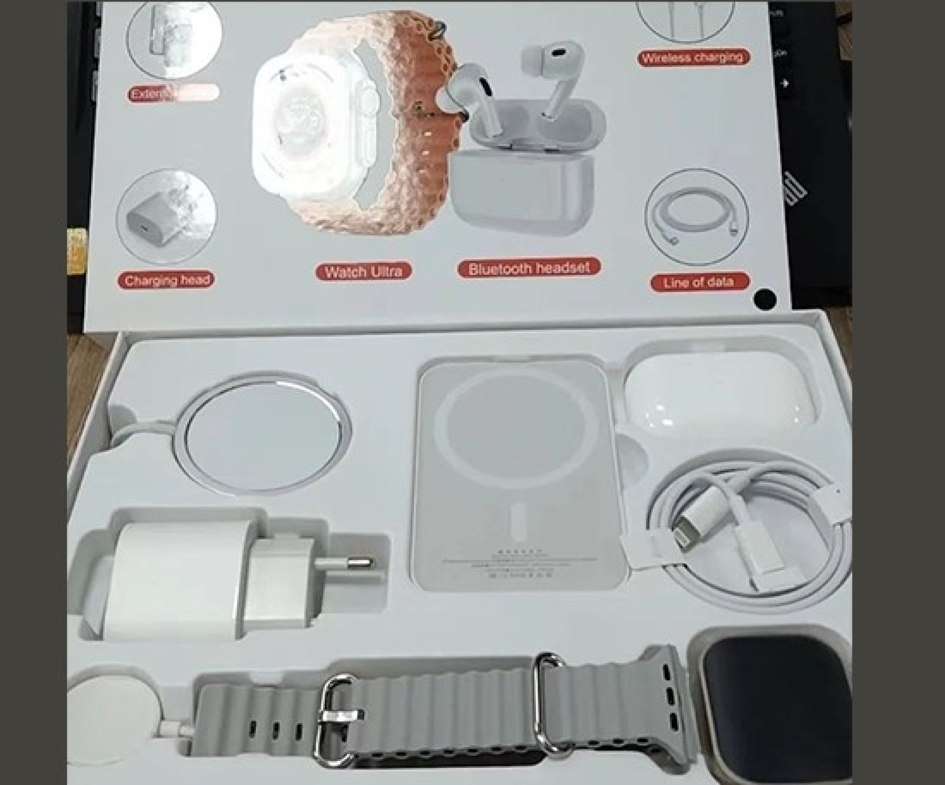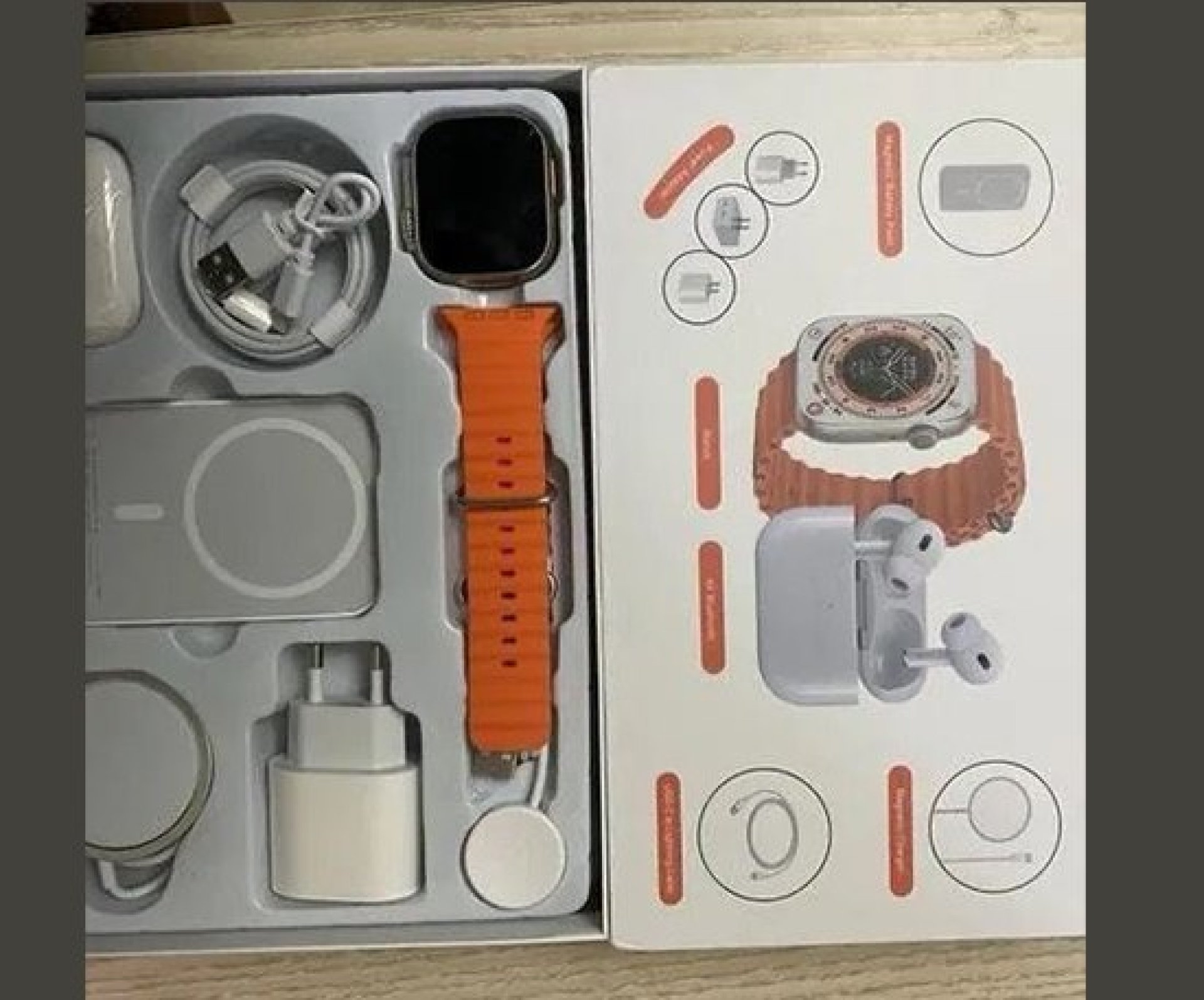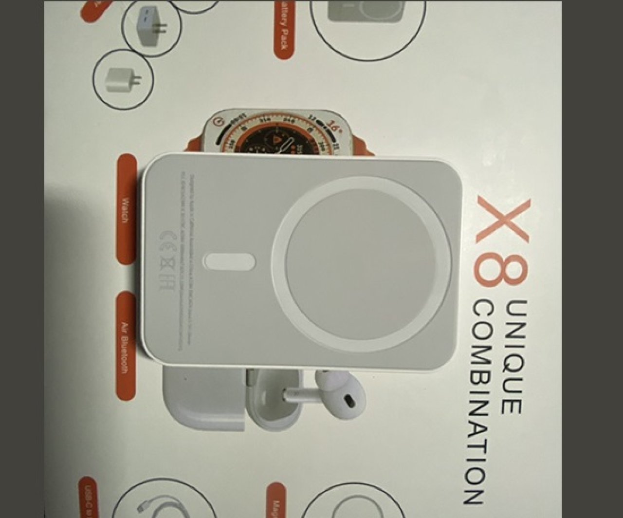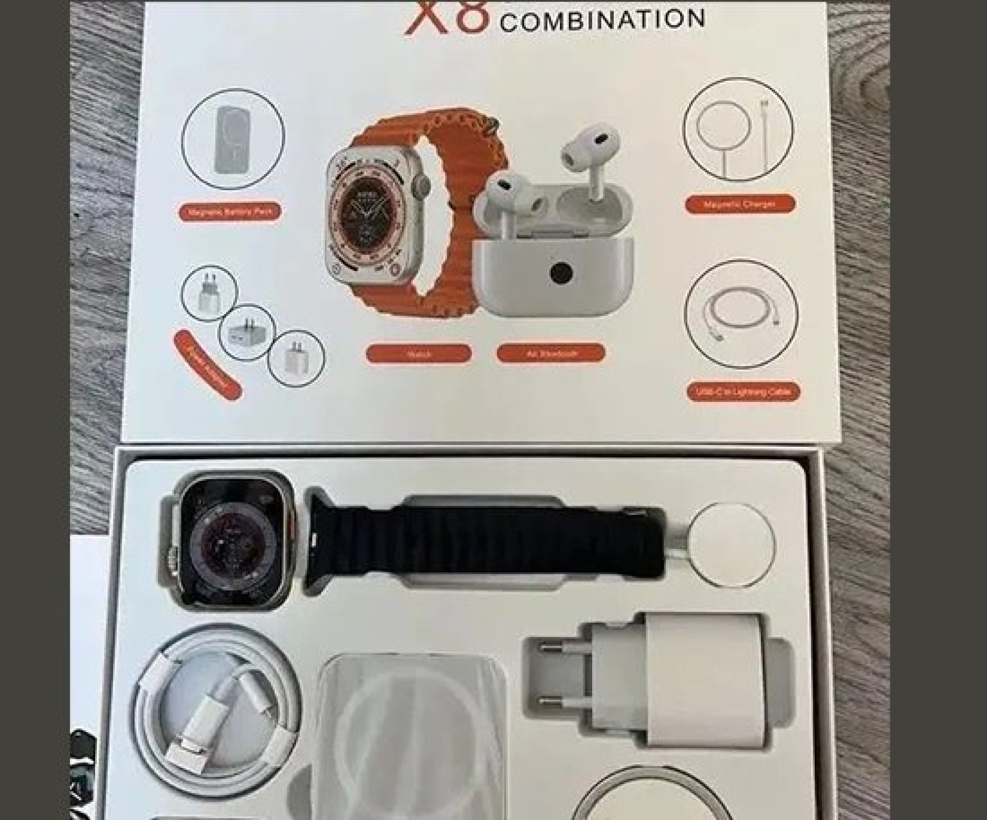 Elevate your digital lifestyle with the X8 UNIQUE COMBINATIONS, a premium 8-in-1 gadget set designed for tech-savvy users who demand performance, style, and convenience. This all-in-one package includes a 49mm HD smartwatch, AirPods Pro, power adapter, USB-C cable, wireless charger, power bank, watch band, and more—making it the perfect companion for fitness, productivity, and entertainment on the go.